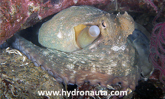 19-02-2026. Esta semana la foto es para uno de los animales de nuestros fondos marinos que presenta un comportamiento claramente inteligente. Todos los cefalópodos, grupo al que pertenece, tienen la capacidad de variar a voluntad, y rápidamente su color corporal, gracias a unas pequeñas células, los cromatóforos, que tienen en su piel. Algunos, además, no solo pueden cambiar de color, sino que pueden también variar la textura de su piel, lo que ayuda a maximizar su camuflaje al ser capaz de adquirir el color y la textura del sustrato donde se encuentre. En el caso particular del animal fotografiado, podemos incluso conocer sus diferentes estados de ánimo dependiendo del color que adquiera en cada momento.
