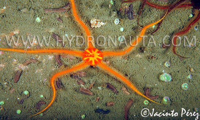 17-1-15. Si algo llama la atención a los que visitan por primera vez nuestros fondos marinos es la enorme cantidad de ofiuras negras, que en algunos casos llegan literalmente a tapizar el sustrato. Algunos buceadores incluso me preguntan si es una plaga; las ofiuras se alimentan de partículas en suspensión y detritus, y a su vez son alimento de otros animales por lo que es un imprescindible eslabón de la enorme y diversa cadena de vida que forman los animales que pueblan nuestras aguas.