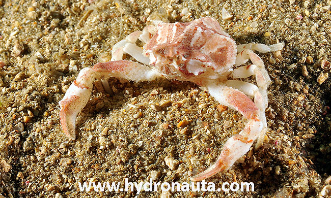 25-01-2018. El curioso cangrejo de caparazón romboidal de la foto de esta semana es una de las 5 especies del género Ebalia presentes en nuestros fondos marinos. Ebalia tuberosa (Pennant, 1777) es la especie más grande de este género presente en nuestras aguas, pudiendo llegar a alcanzar una de longitud de caparazón de 17 milímetros. El caparazón es de forma romboidal, algo más ancho que alto, con la superficie totalmente recubierta por gruesos gránulos o tubérculos, con una parte de su superficie elevada en forma de cruz. La región frontal está proyectada delante de las órbitas con su margen frontal curvada hacia dentro; los ojos y sus órbitas son muy pequeños. La región posterior es cóncava en los machos y recta a ligeramente convexa en las hembras. Los quelípedos son de igual tamaño, siendo más largos y robustos los de los machos. El segundo al quinto par de pereiópodos son delgados, más cortos que los quelípedos y finamente tuberculados. El abdomen, en ambos sexos con los segmentos tercero al sexto fusionados. Color variable, normalmente de tonos marronáceos con sombras más oscuras.